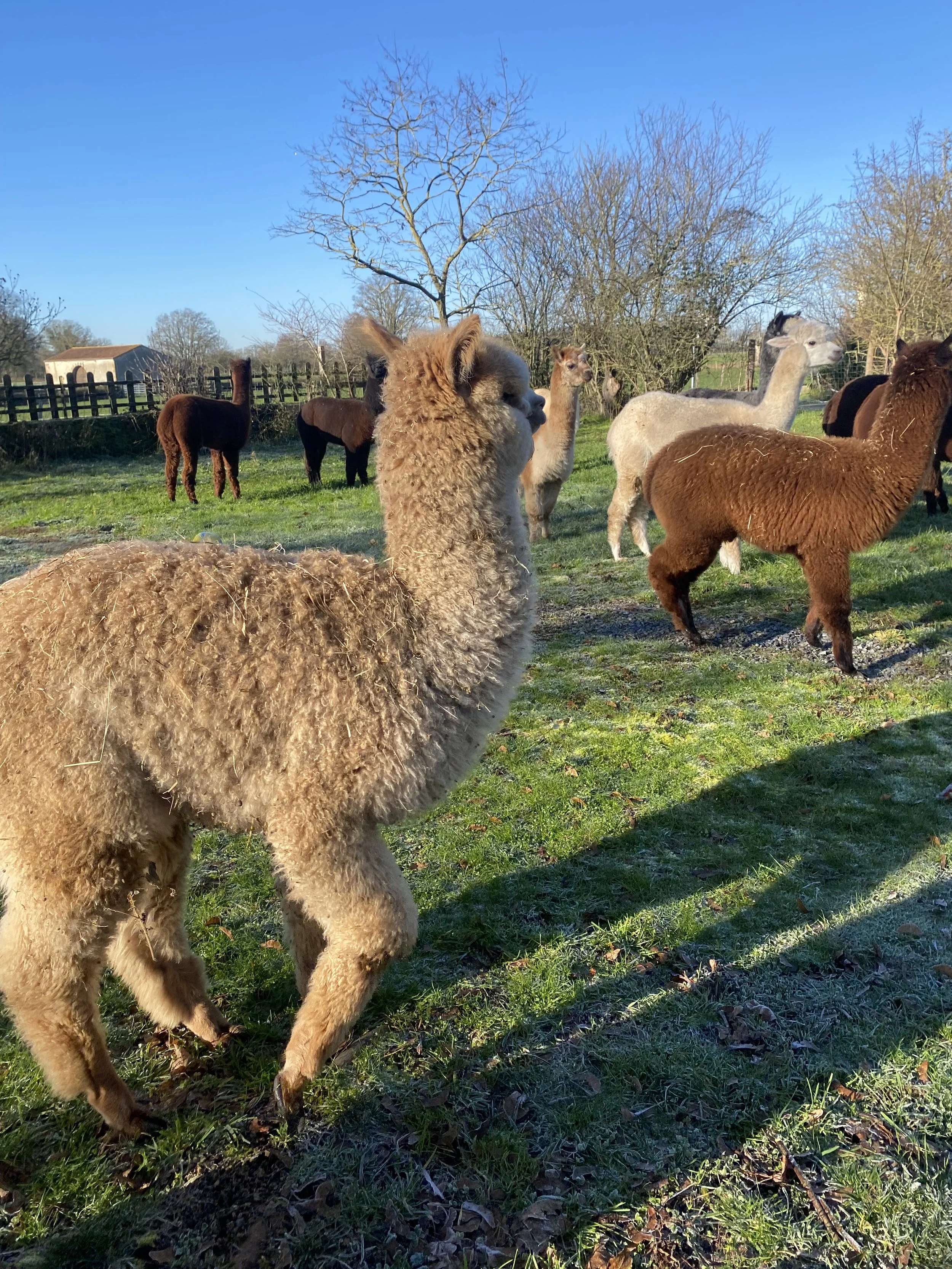 All 2023 babies on the farm are doing well. Blossom’s cria (baby alpaca) Buddy, and Astrid’s cria Joni have both started their halter training. This is less about training to walk with customers and more about them learning to be handled for regular health checks and at a minimum them be able to be walked if needed for healthcare (for example to travel to the vets). Our (human) baby Emilie is also doing well and getting to know the herd well, and they’re starting to get used to her too.